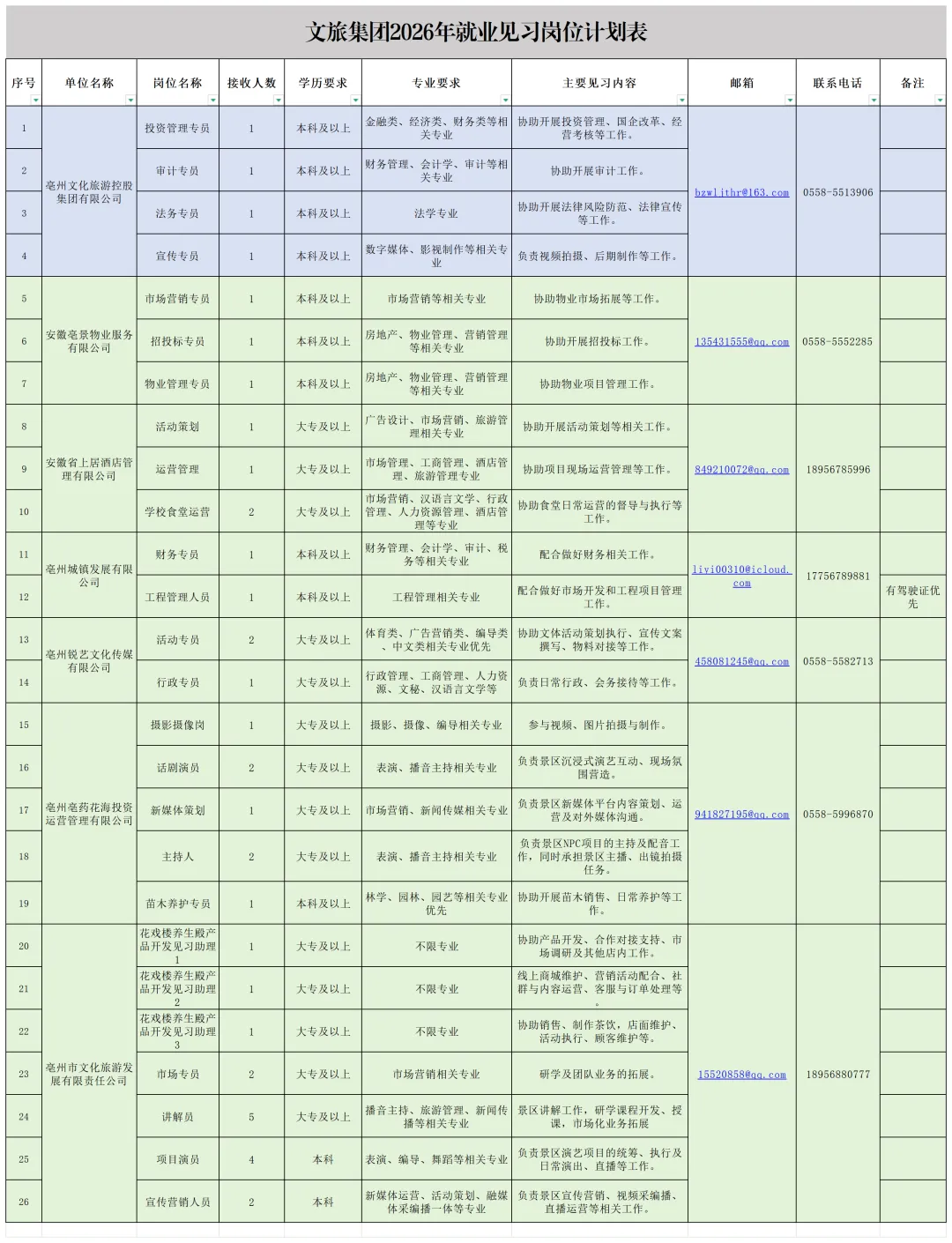 岗位咨询:亳州文旅集团人力资源部 0558-5513906